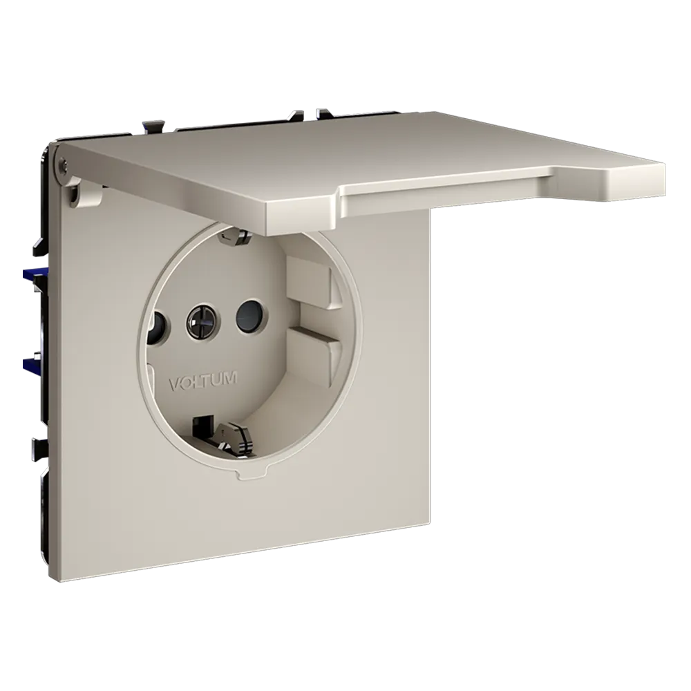 Розетка VOLTUM S70 с заземлением и защитными шторками и откидной крышкой  — это решение максимальной безопасности и эстетики для современного интерьера. Идеально подходит для детских комнат, ванных, прихожих, кухонь и уличных зон под навесом, где важна защита от пыли, брызг и случайного контакта с токоведущими частями.